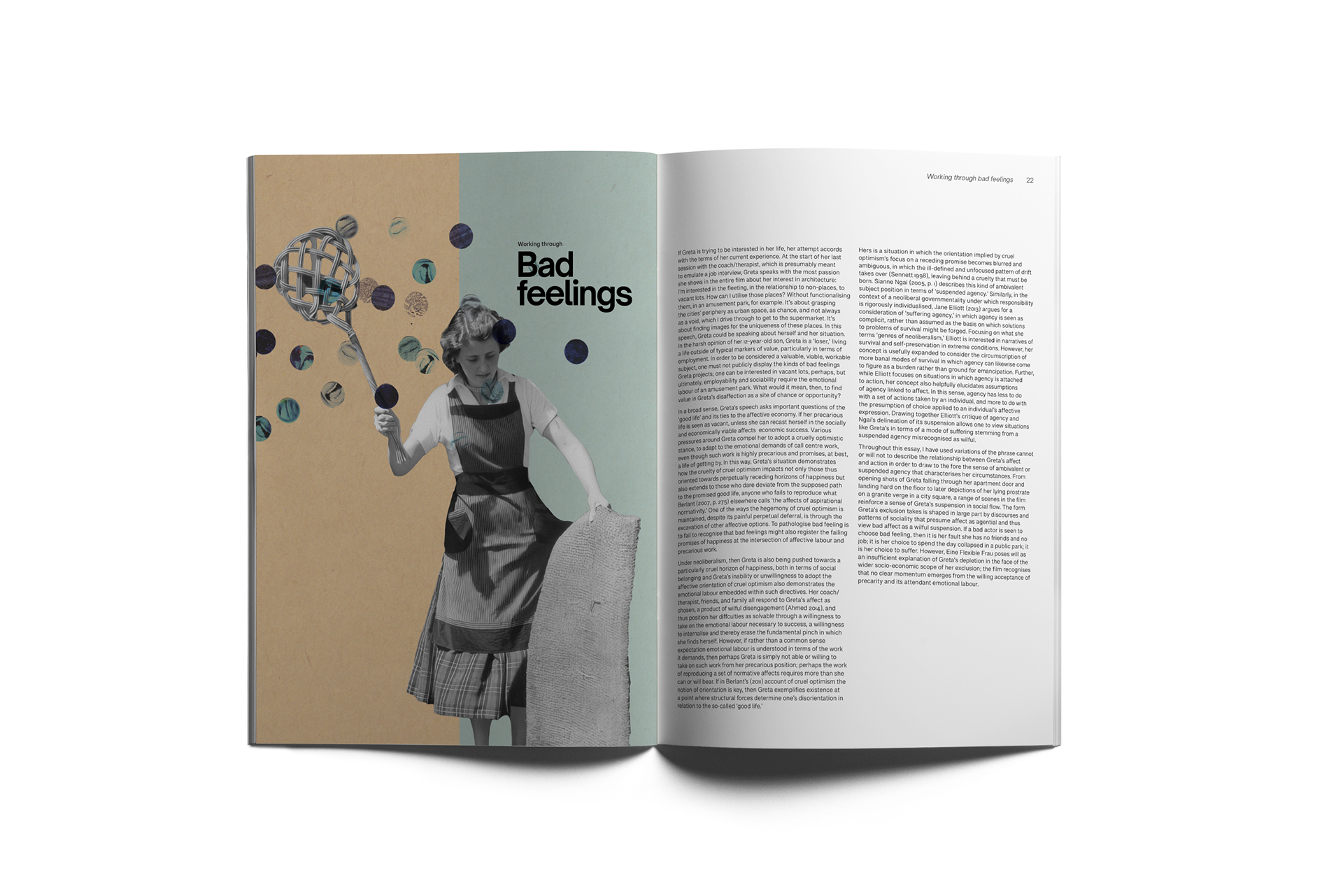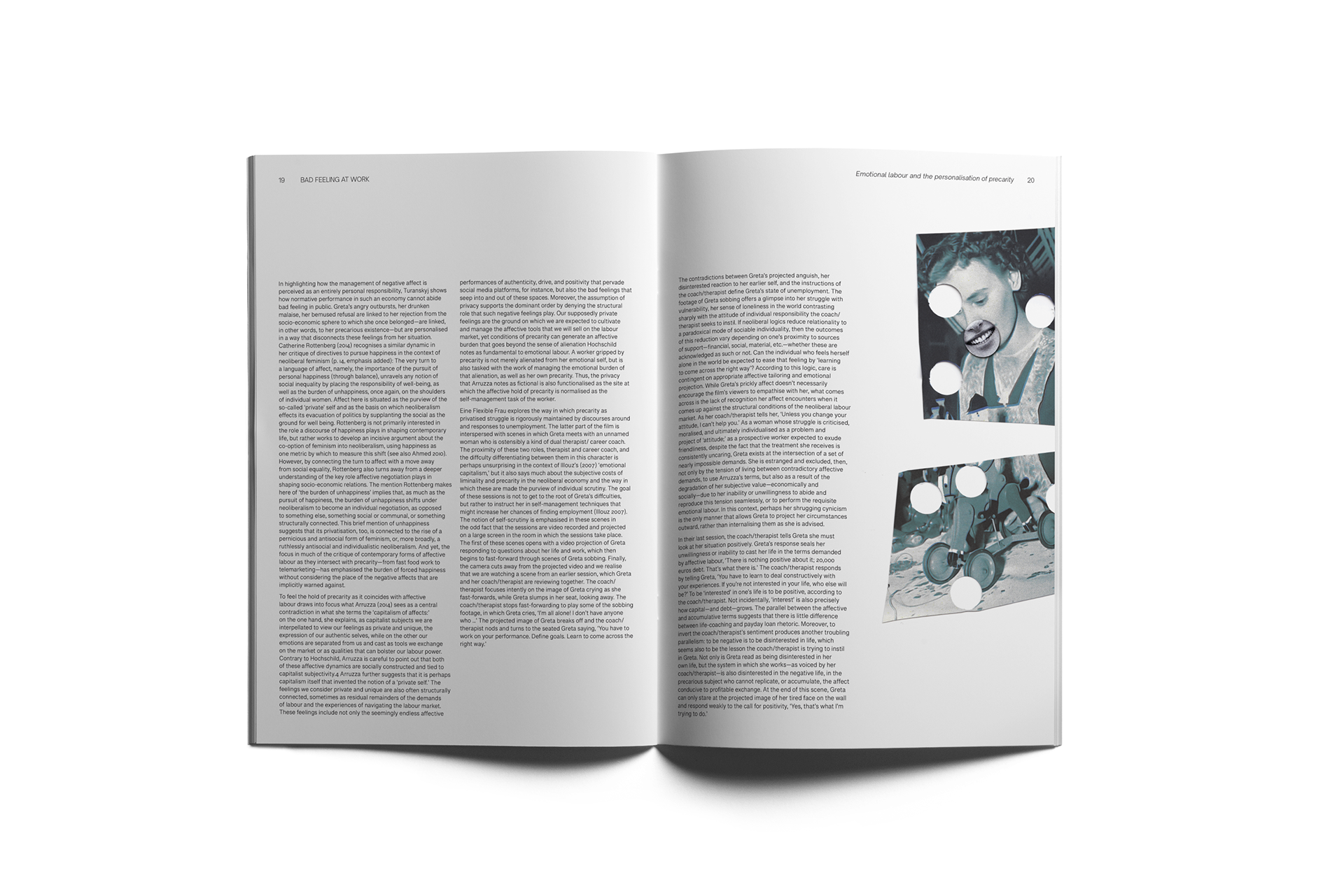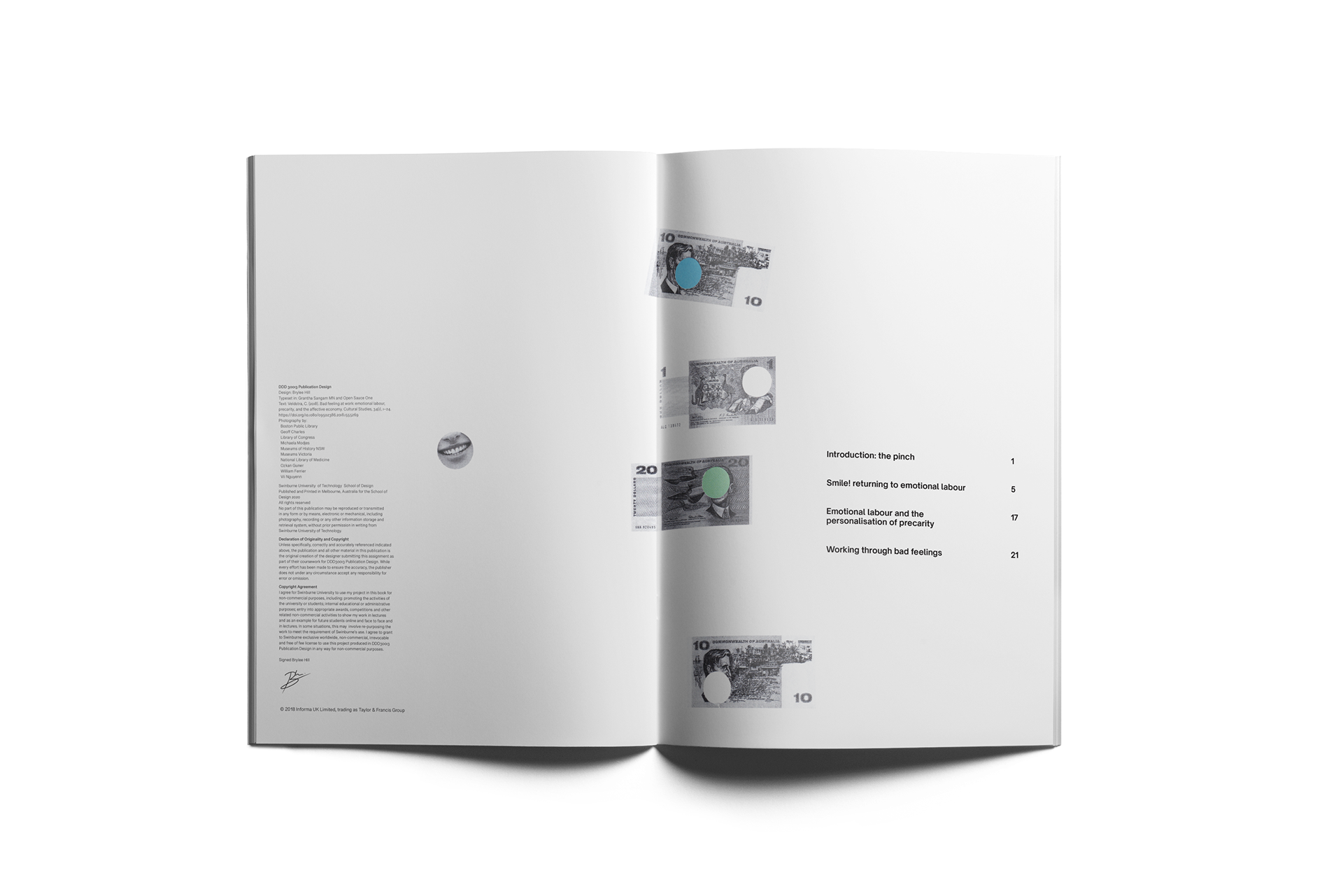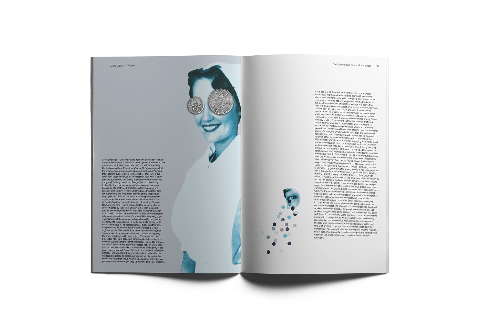 A 28-page publication exploring the concepts of emotional labour, hiding bad feelings, and performing authenticity under the weight of economic precarity. An expressive visual language inspired by the concept of repression and performance was developed, ultimately transforming into a visual representation of the ‘bad feelings’. Manipulated figures and unsettling smiles instil a growing sense of discomfit throughout the progression of the publication.