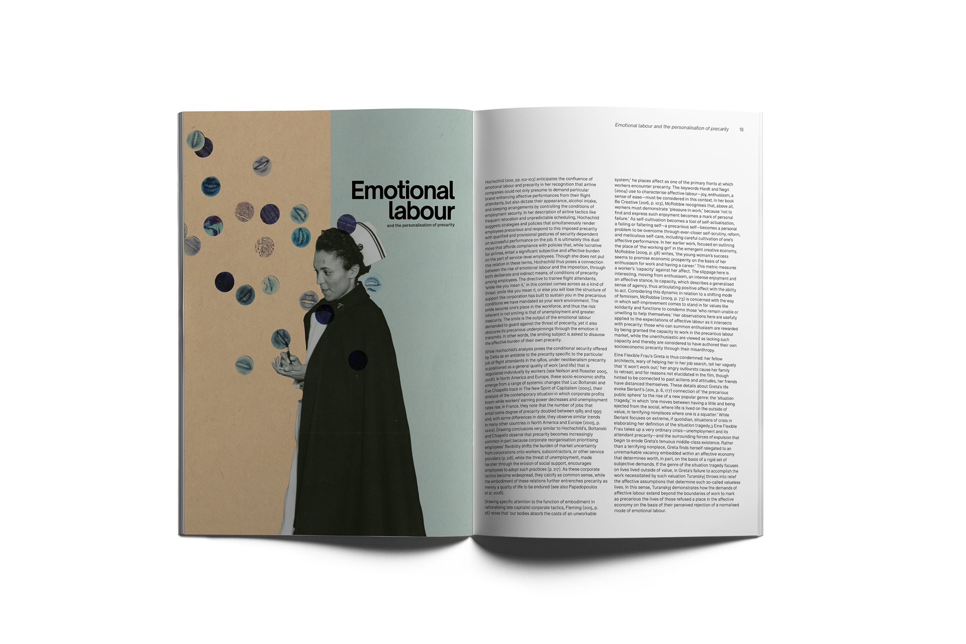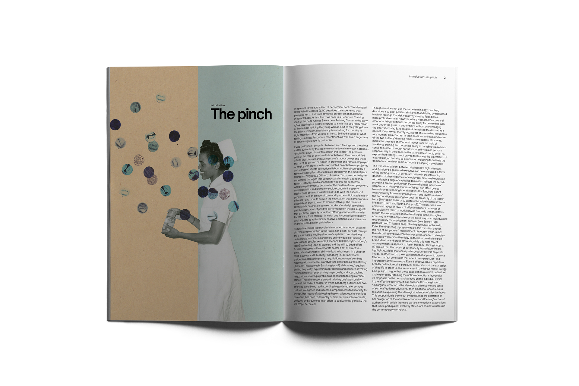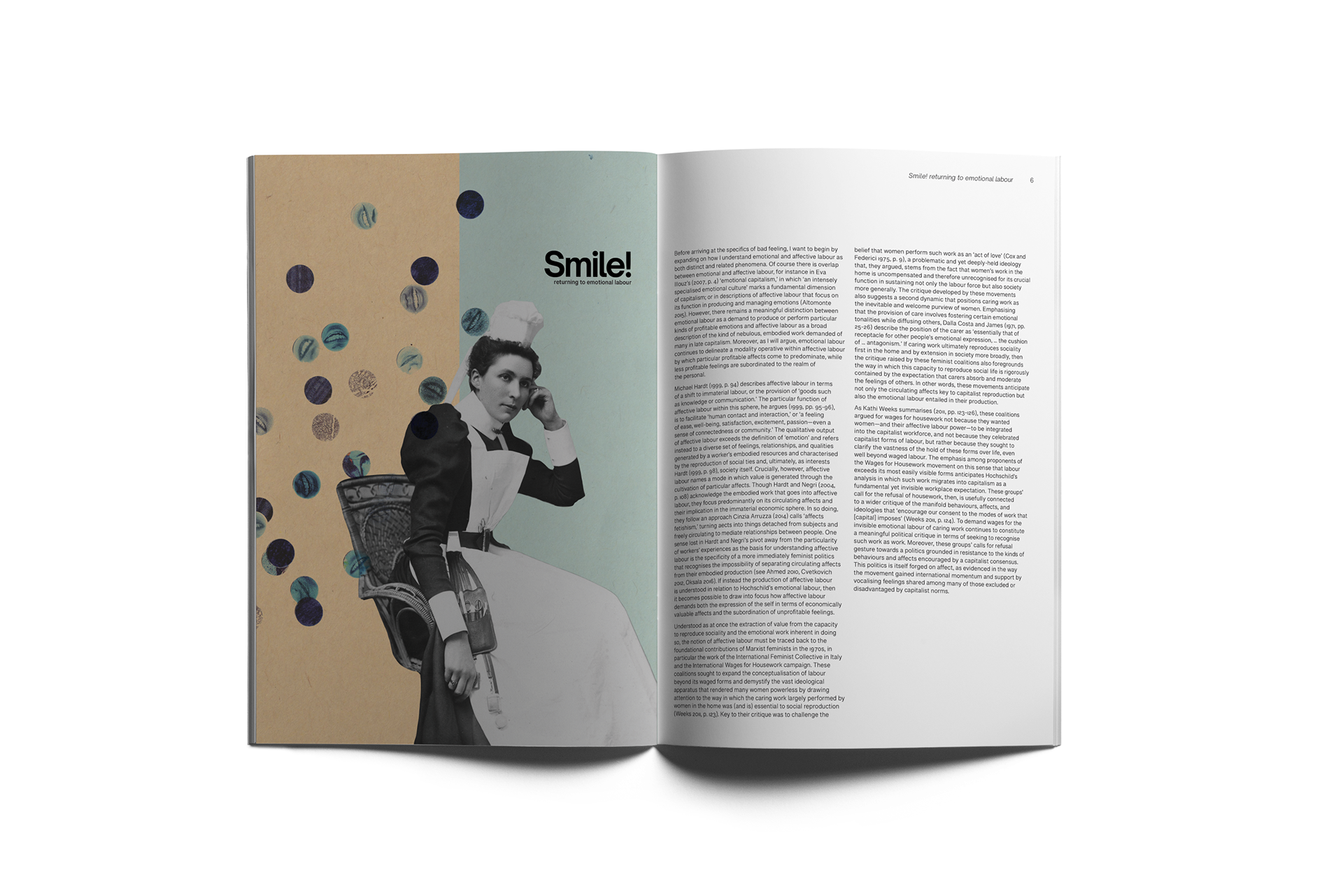 A 28-page publication exploring the concepts of emotional labour, hiding bad feelings, and performing authenticity under the weight of economic precarity. An expressive visual language inspired by the concept of repression and performance was developed, ultimately transforming into a visual representation of the ‘bad feelings’. Manipulated figures and unsettling smiles instil a growing sense of discomfit throughout the progression of the publication.