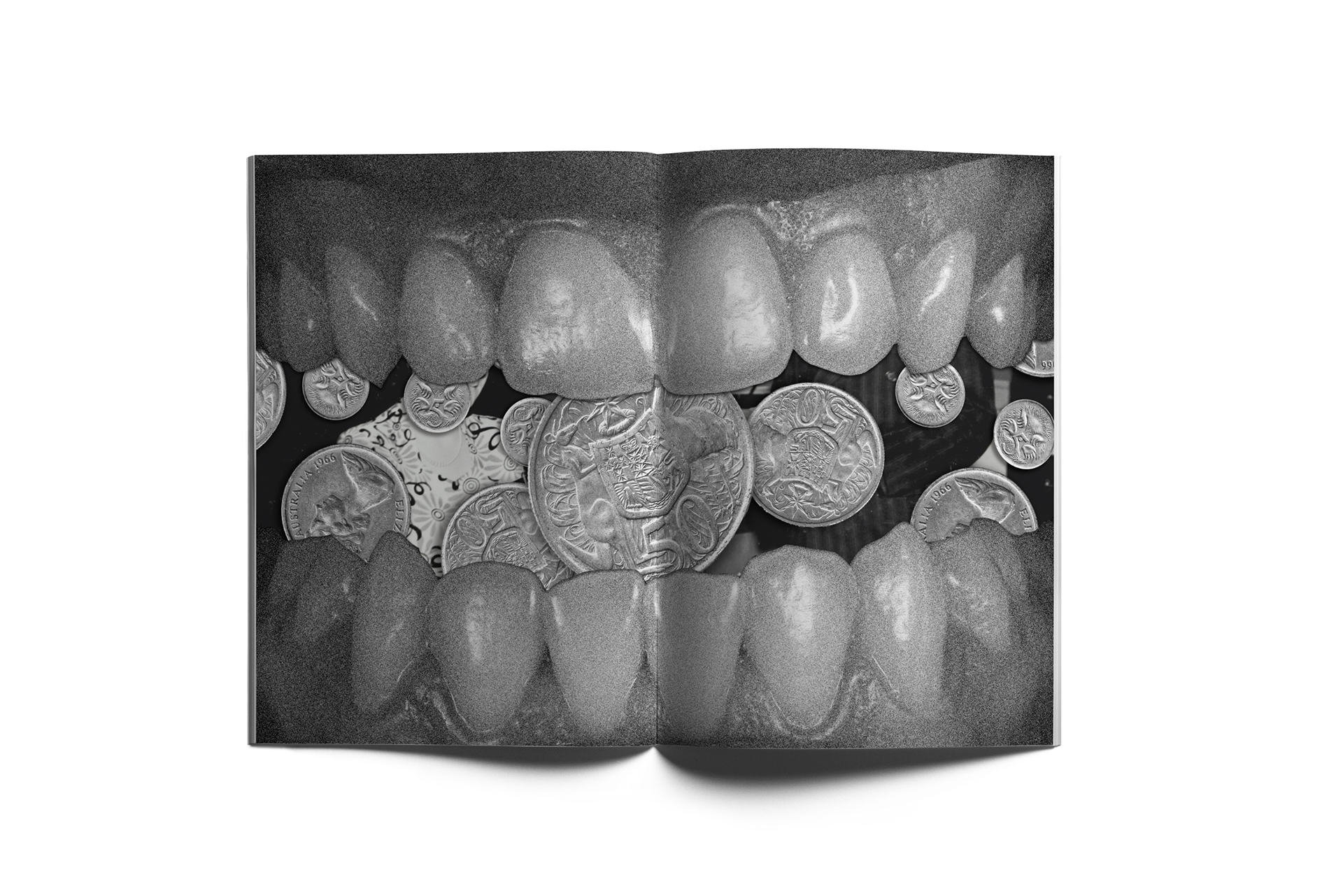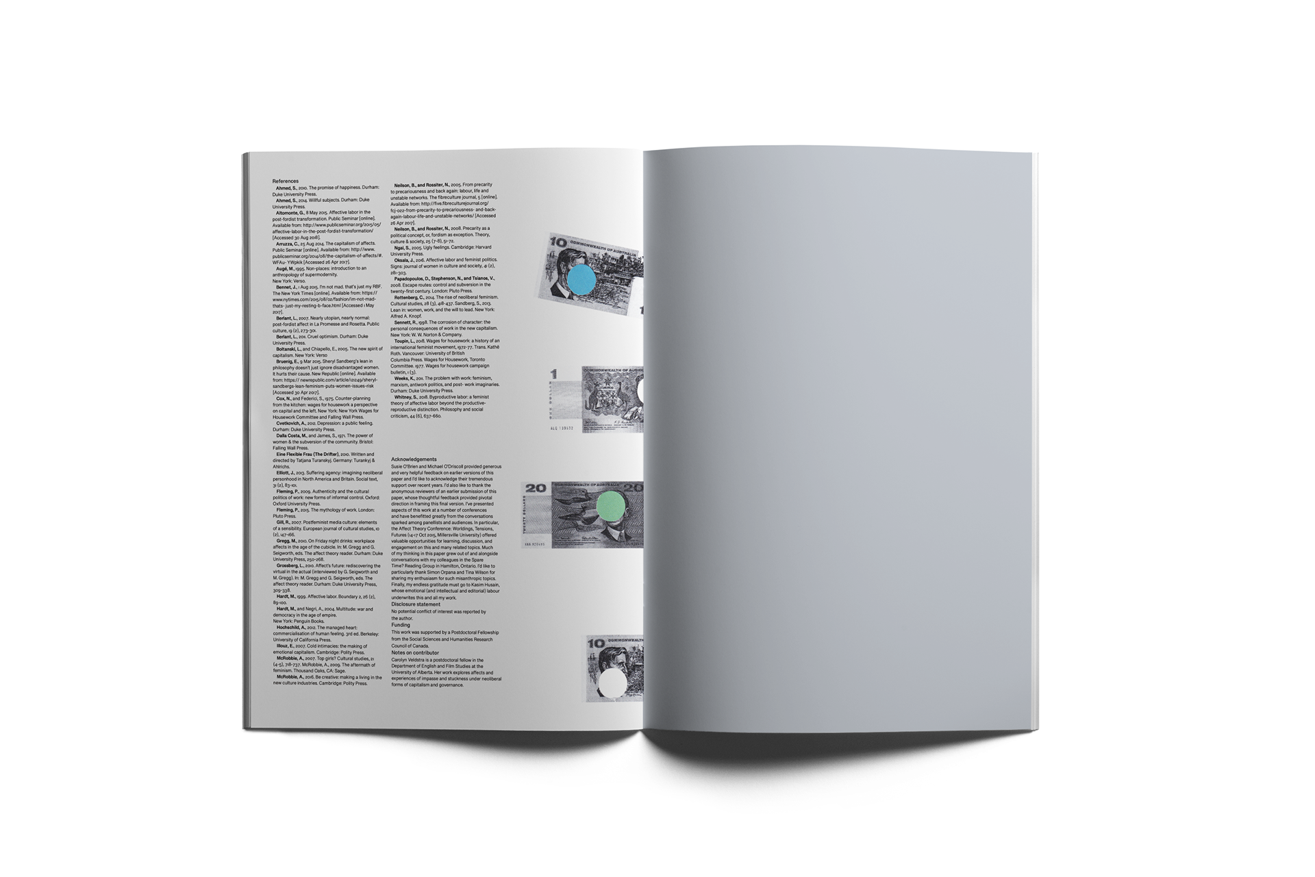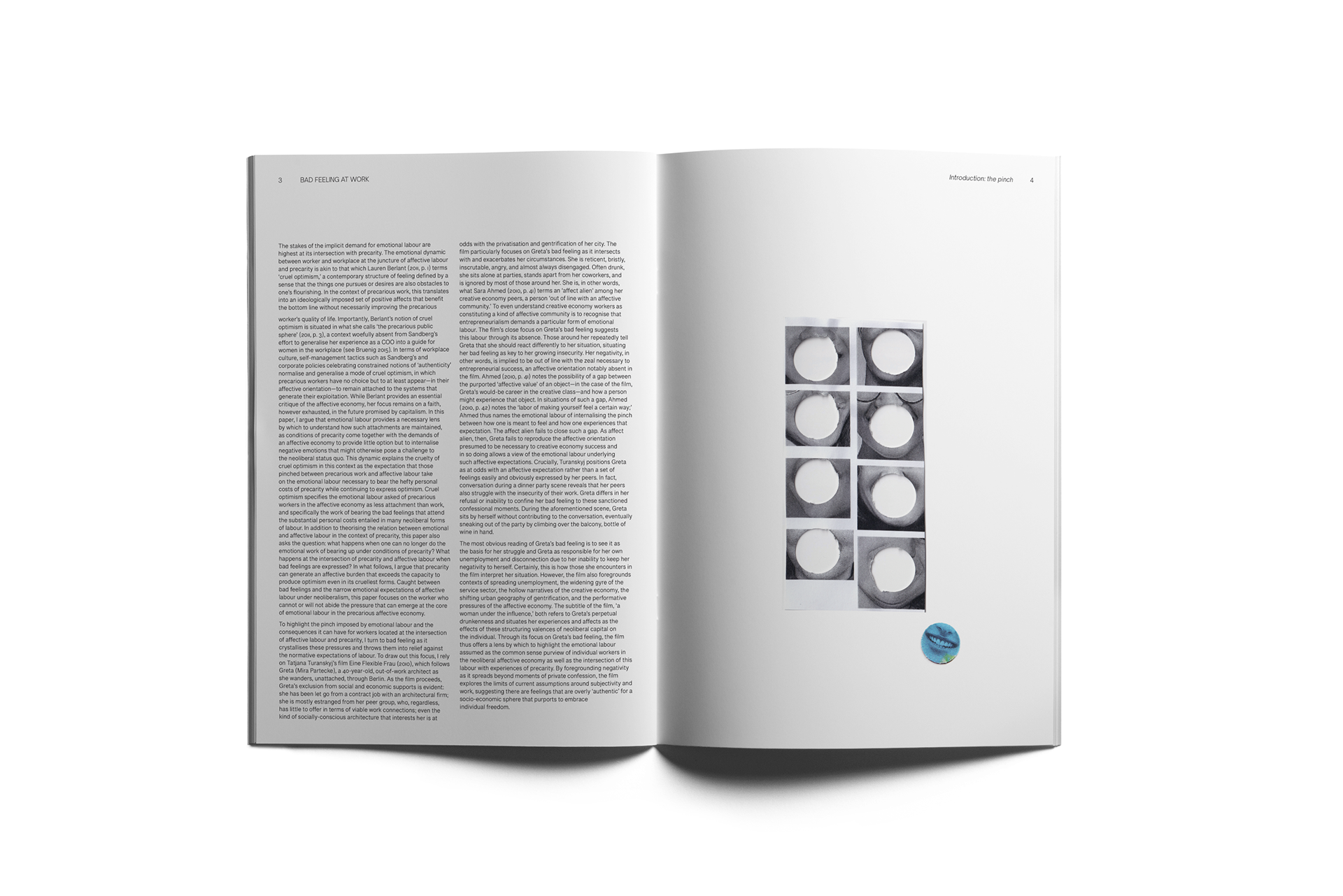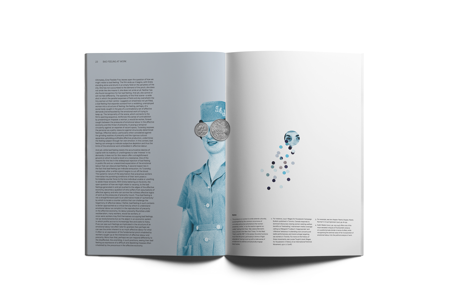 A 28-page publication exploring the concepts of emotional labour, hiding bad feelings, and performing authenticity under the weight of economic precarity. An expressive visual language inspired by the concept of repression and performance was developed, ultimately transforming into a visual representation of the ‘bad feelings’. Manipulated figures and unsettling smiles instil a growing sense of discomfit throughout the progression of the publication.