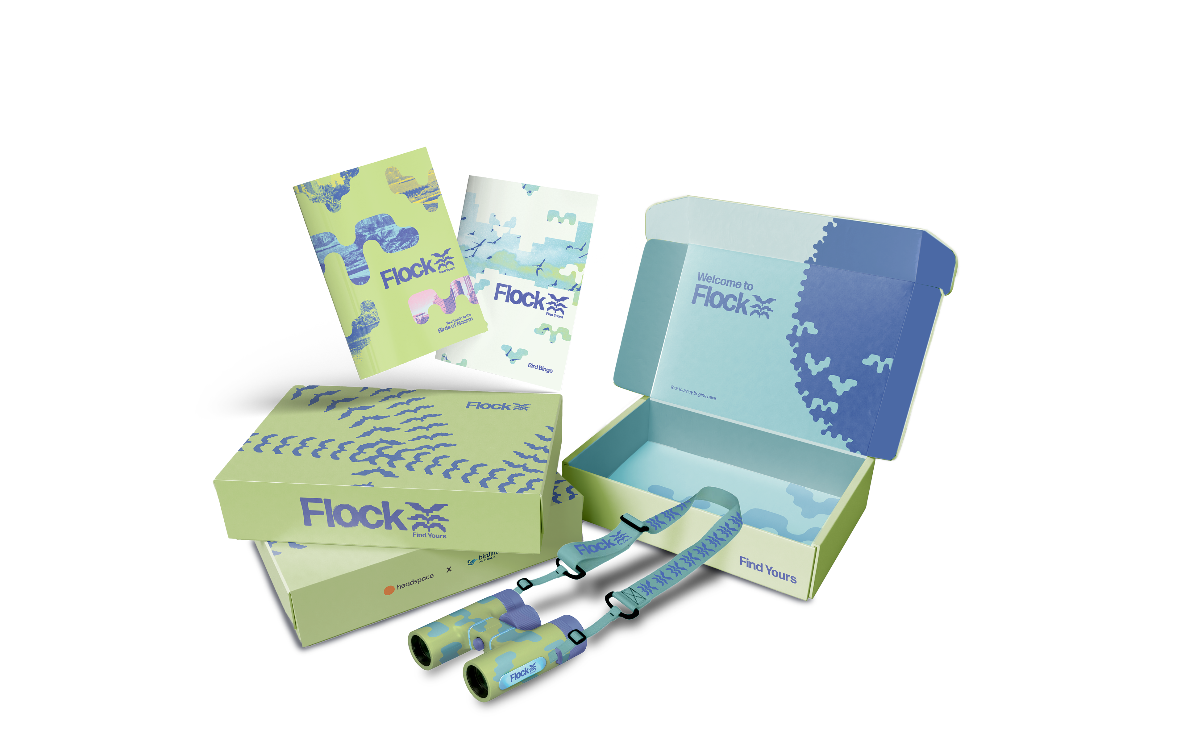A logotype and campaign identity for Flock, a non-profit youth birding initiative aiming to improve youth mental health and interpersonal connections through the world of birdwatching. Flock was posed with the challenge of making birding appealing to a young Naarm audience, adopting a playful and unique visual aesthetic whilst remaining true to the core values of inclusivity, community, and respecting birdlife.