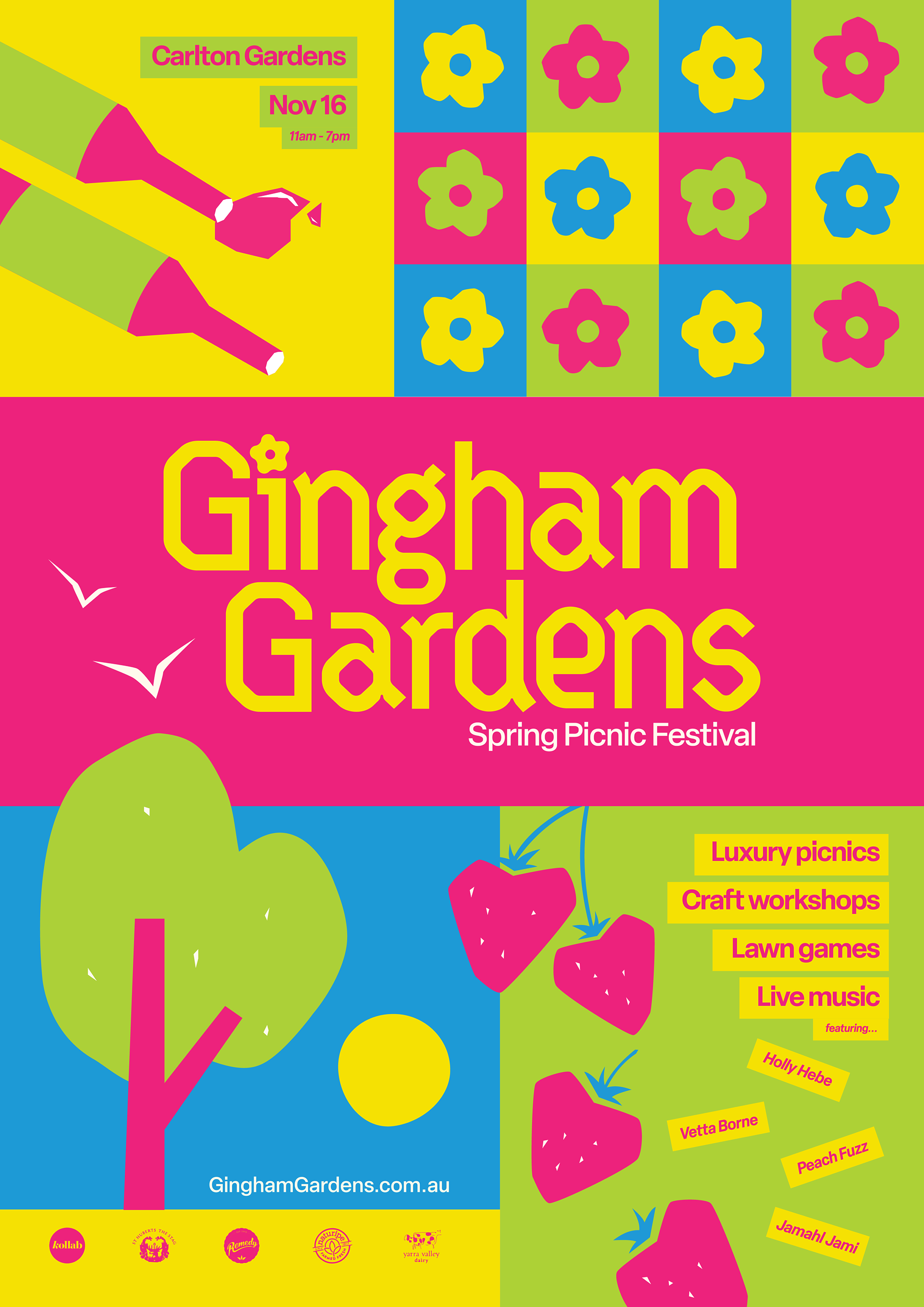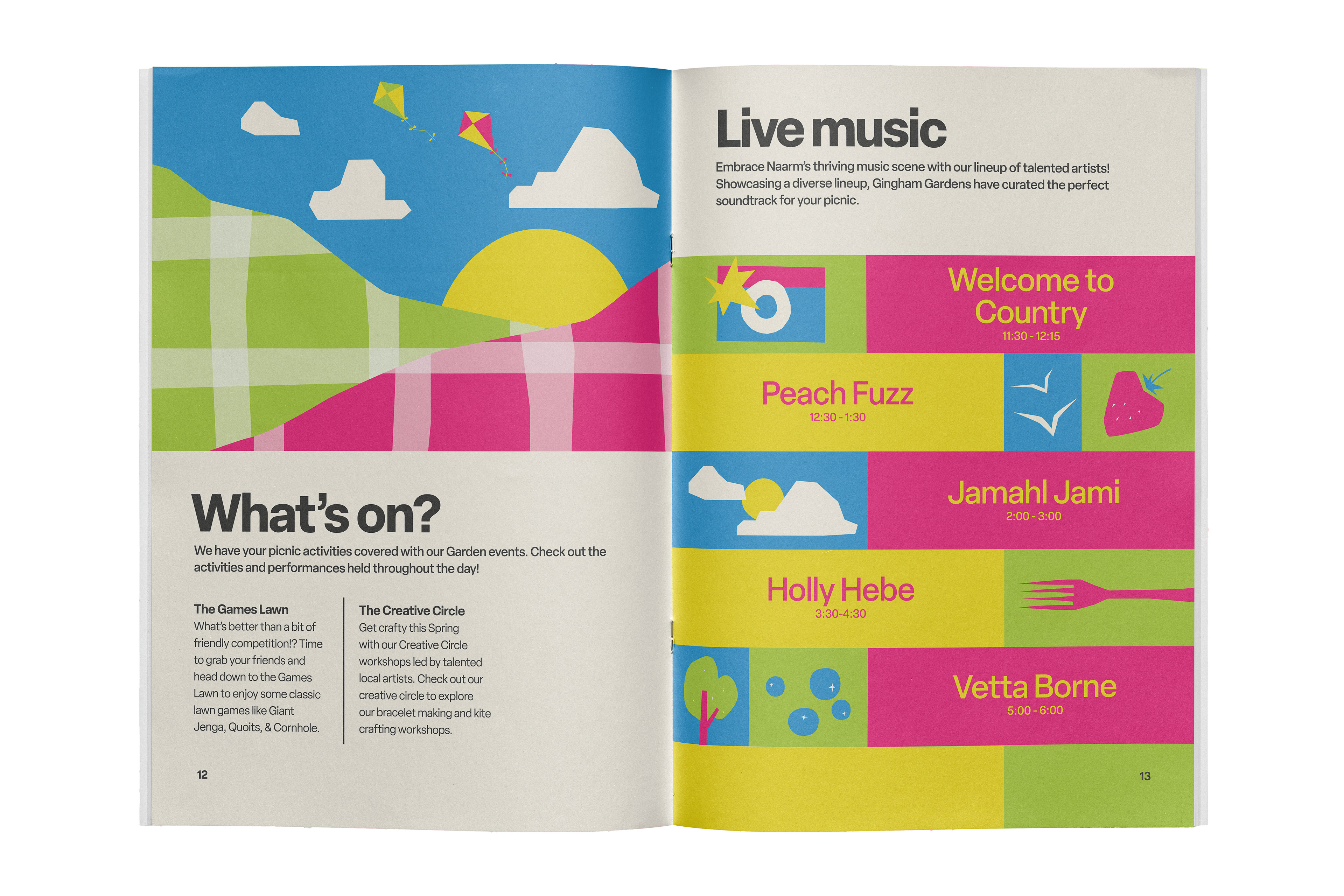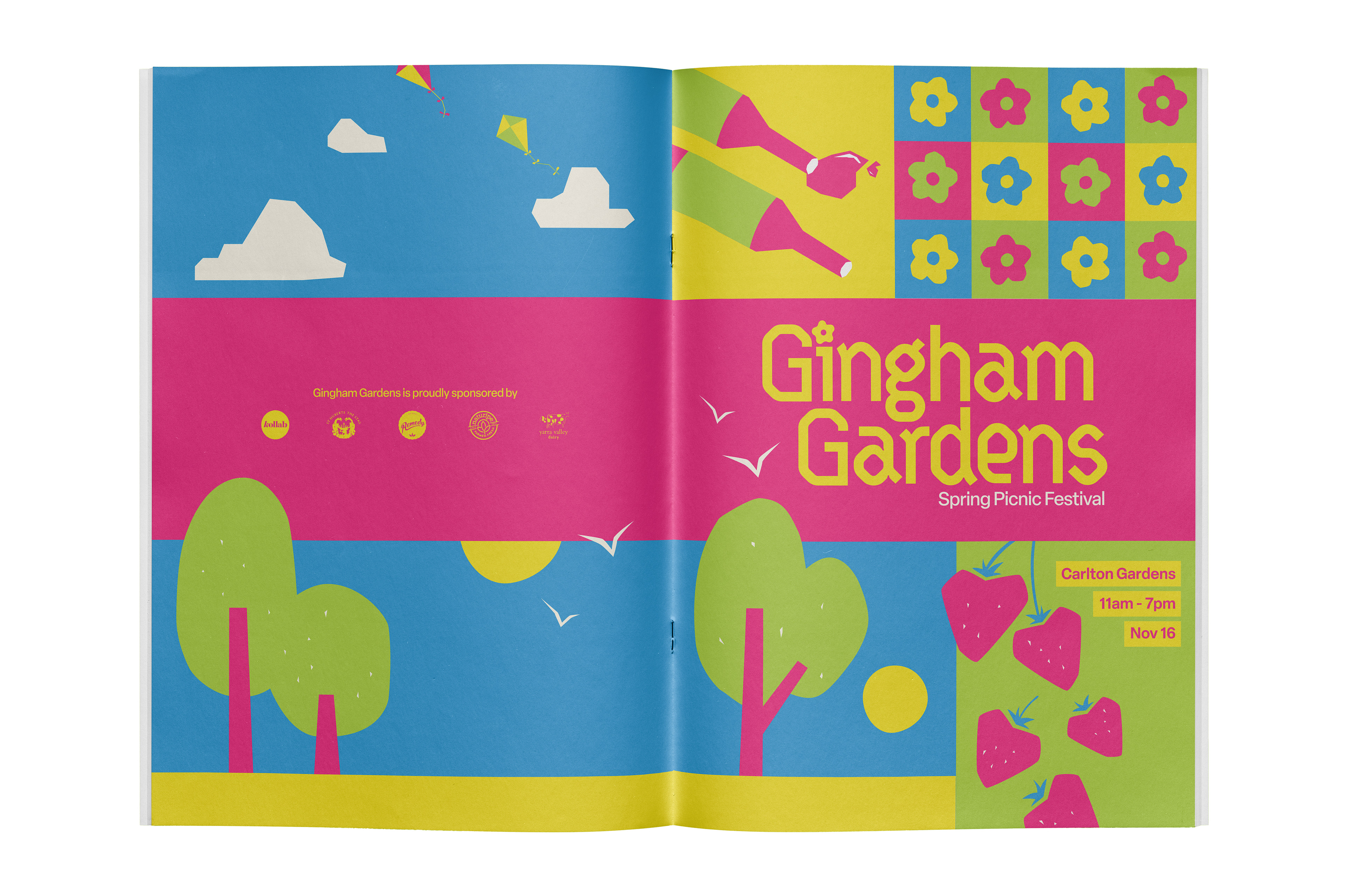 Brand identity, 14-page festival guidebook, and promotional poster for Gingham Gardens Spring Picnic Festival. A playful and bold visual language was developed to capture the vibrancy of the festival. A unique modified typeface, bright colour palette, and quirky vector illustrations establish a bright and refreshing brand identity.