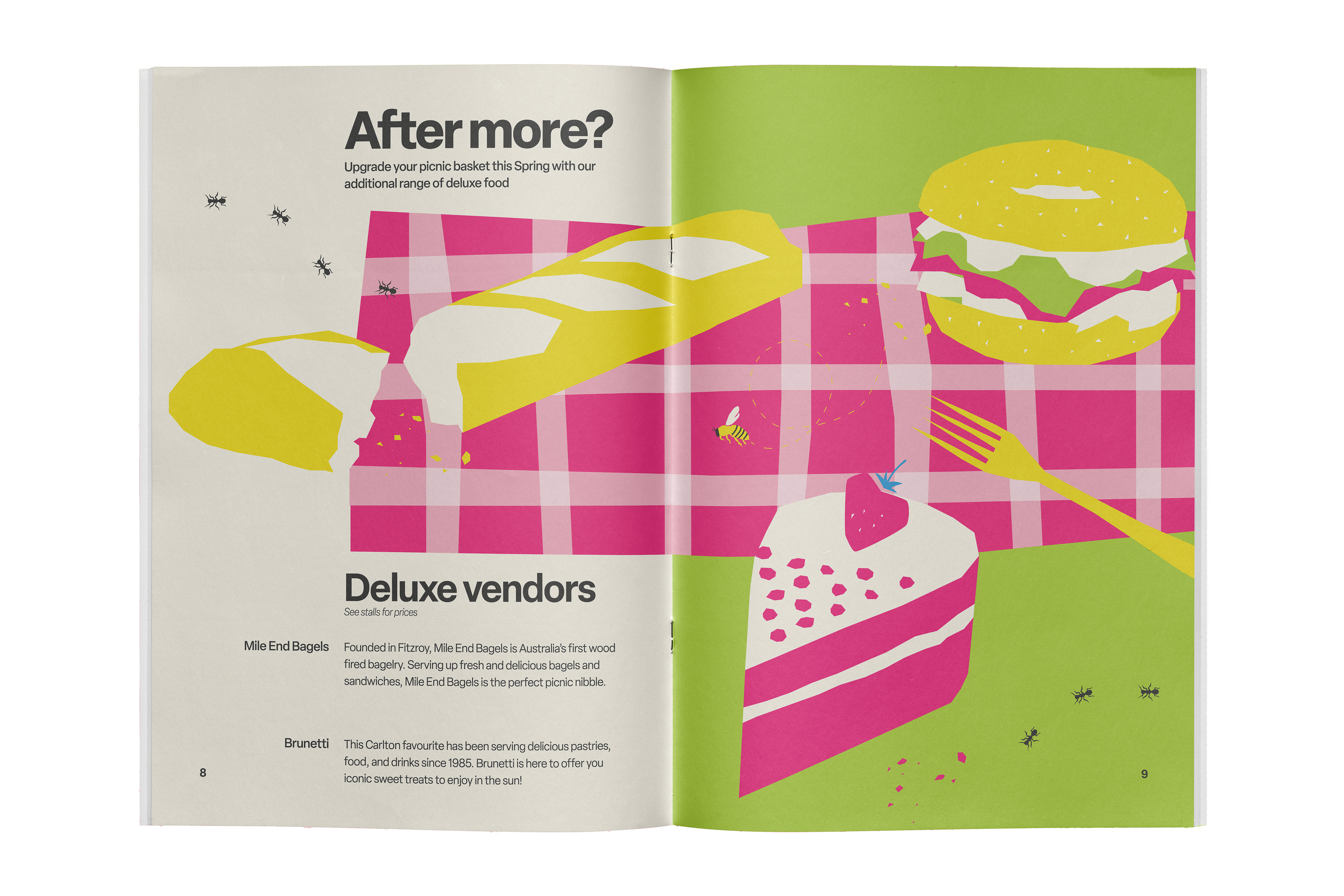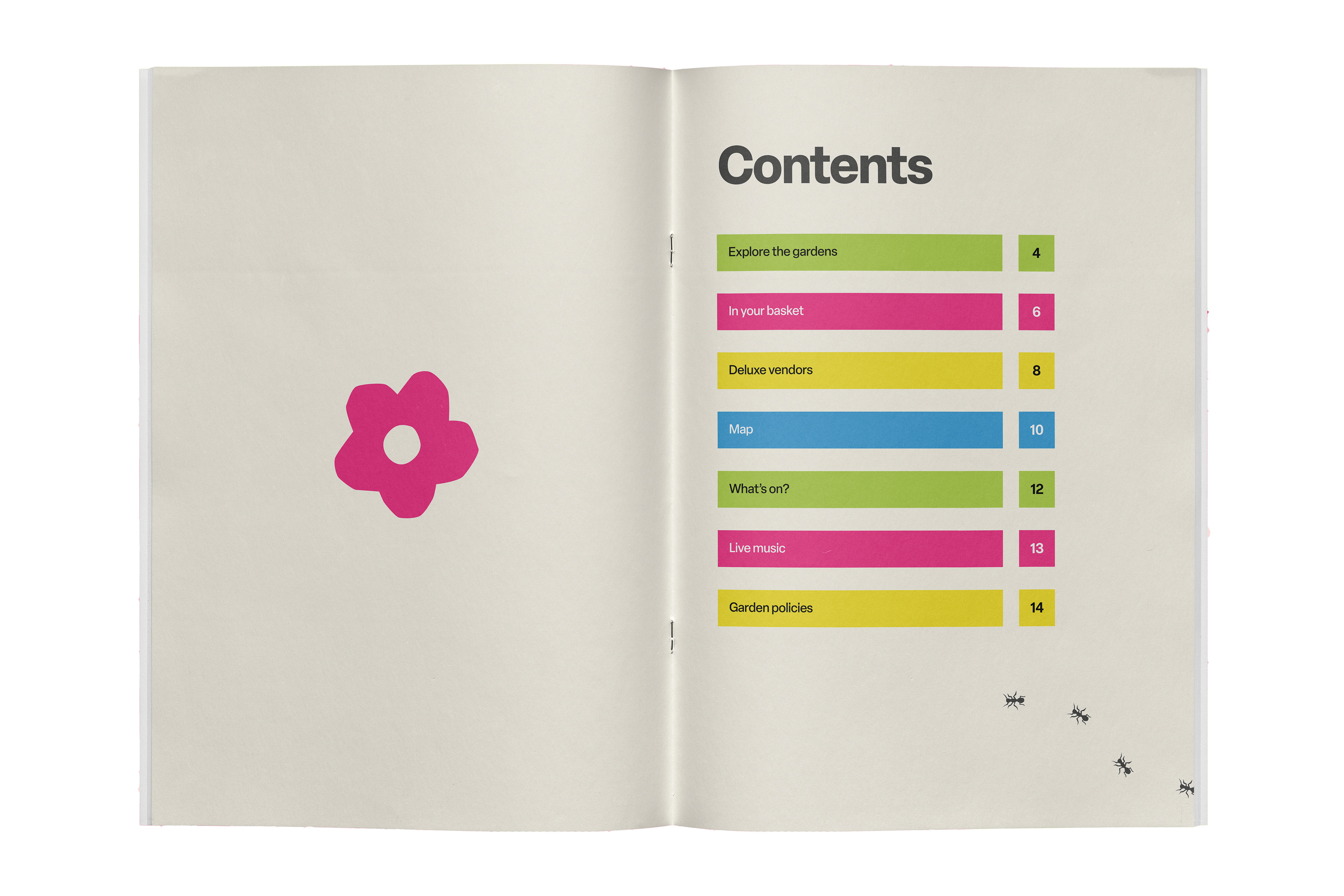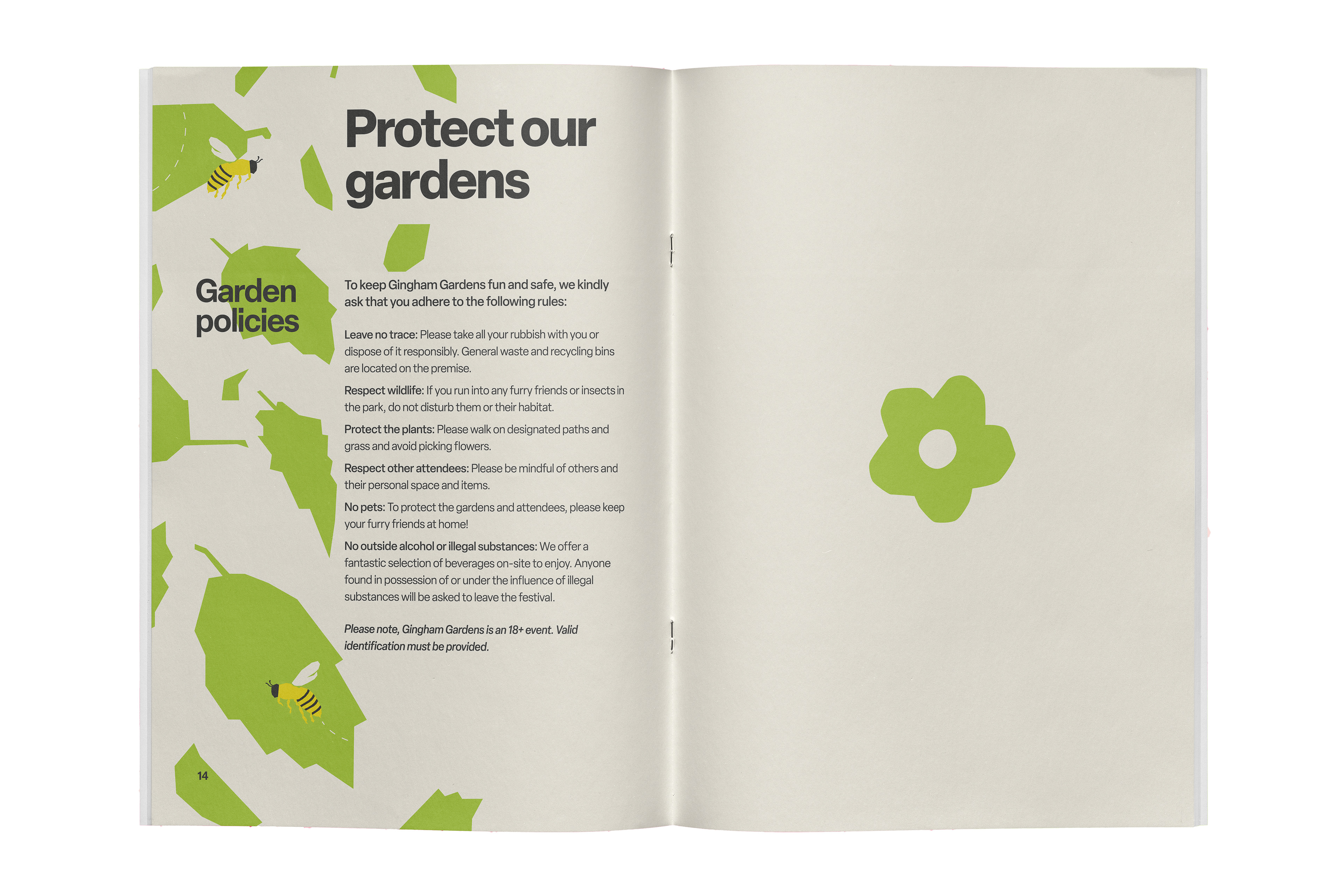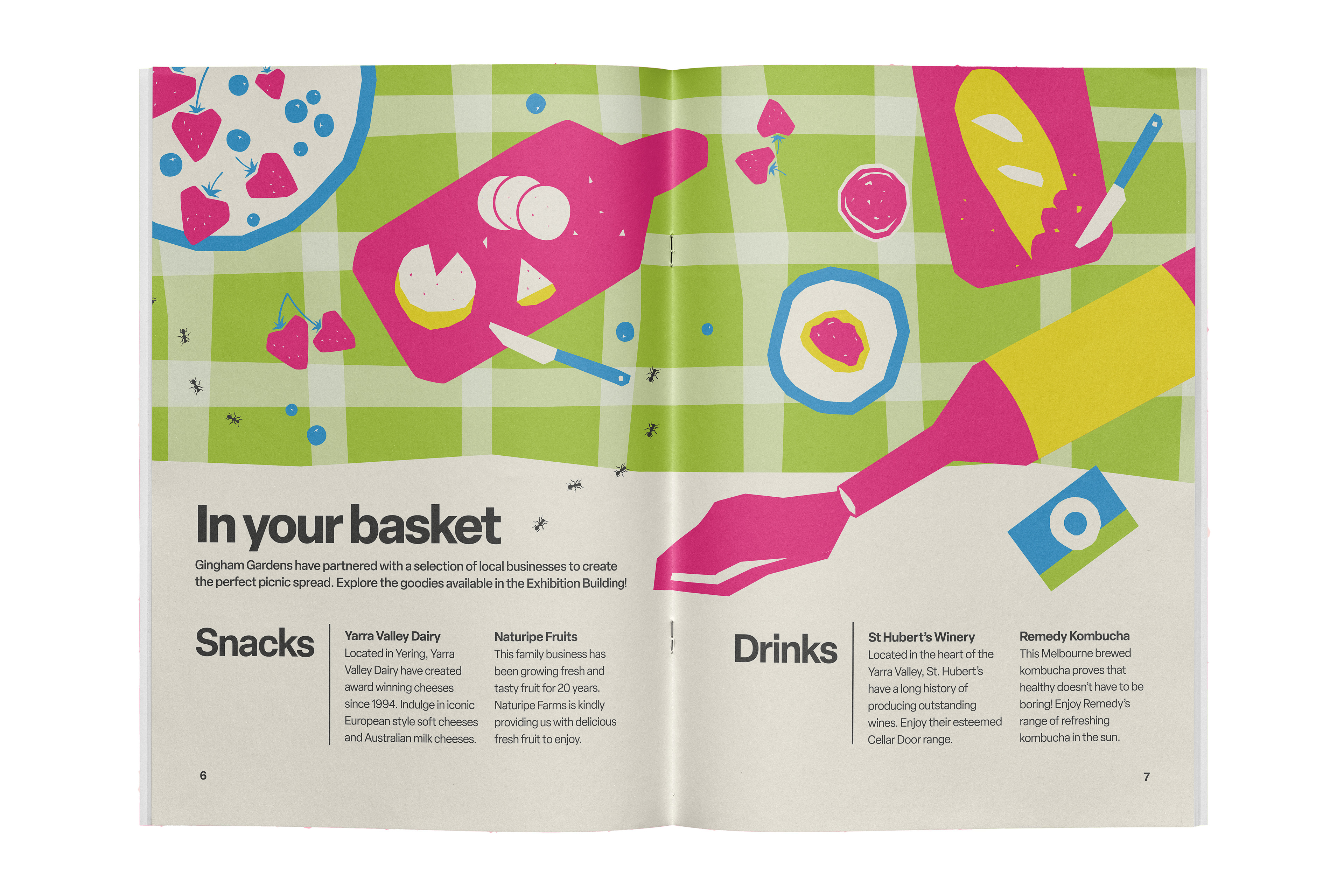 Brand identity, 14-page festival guidebook, and promotional poster for Gingham Gardens Spring Picnic Festival. A playful and bold visual language was developed to capture the vibrancy of the festival. A unique modified typeface, bright colour palette, and quirky vector illustrations establish a bright and refreshing brand identity.