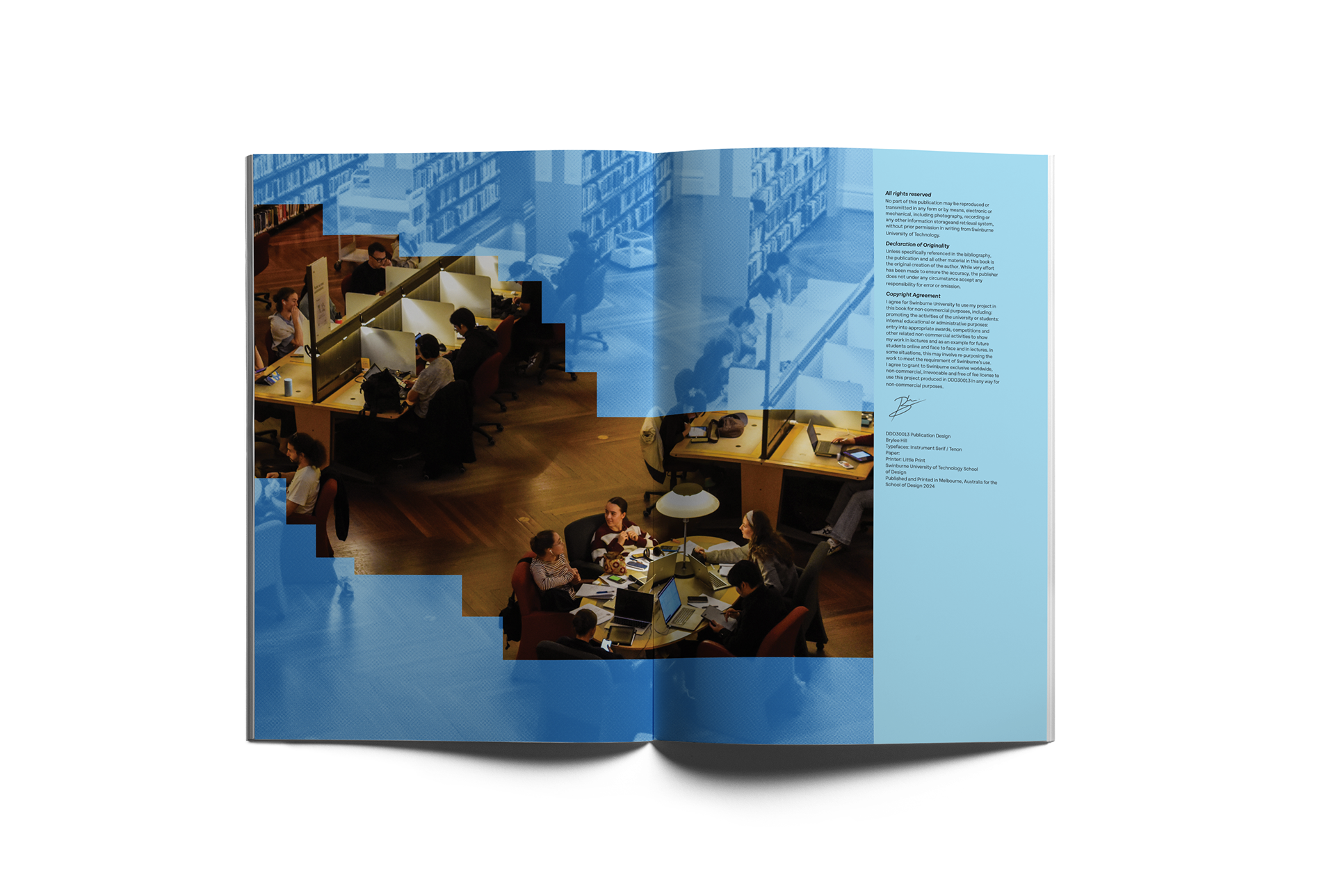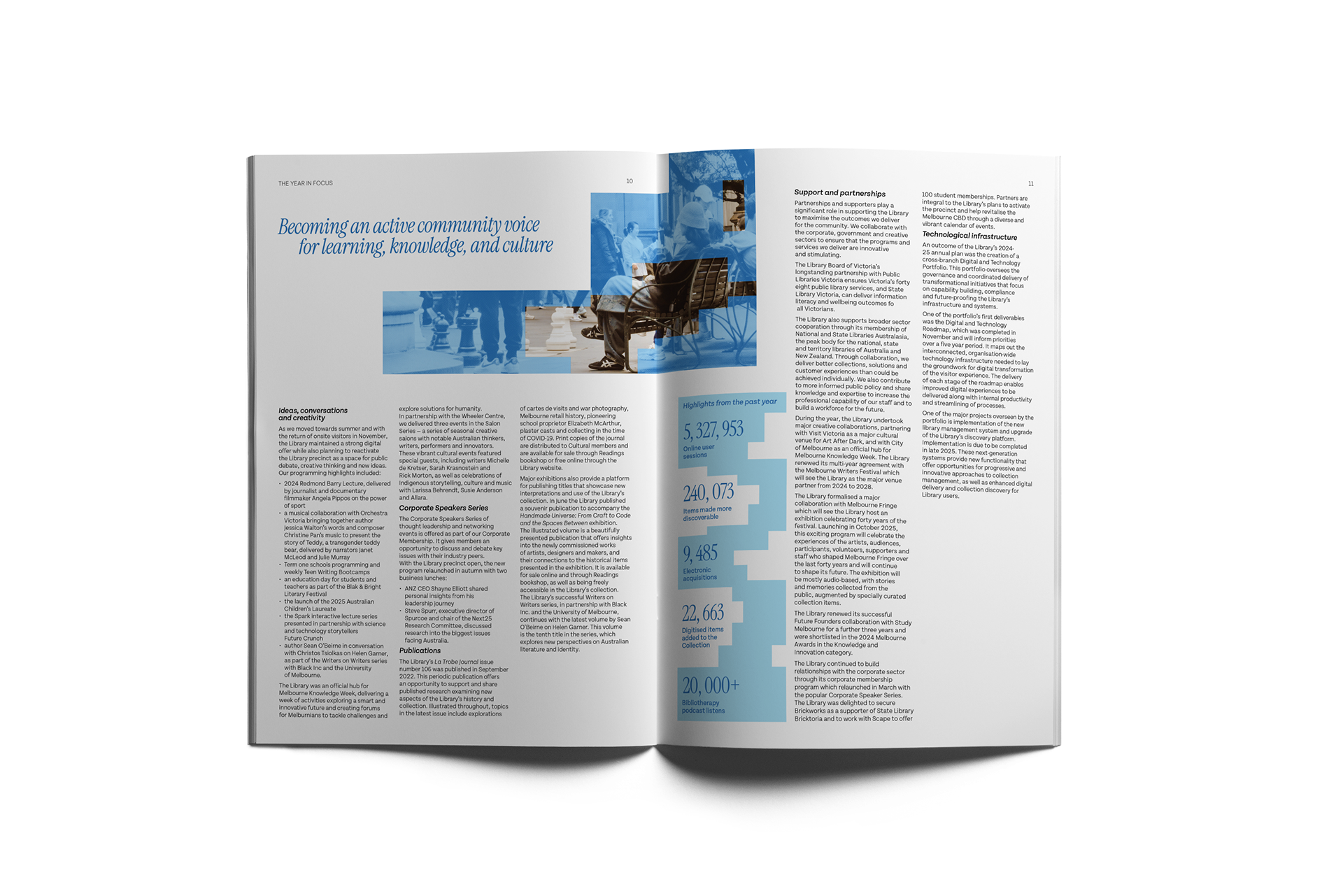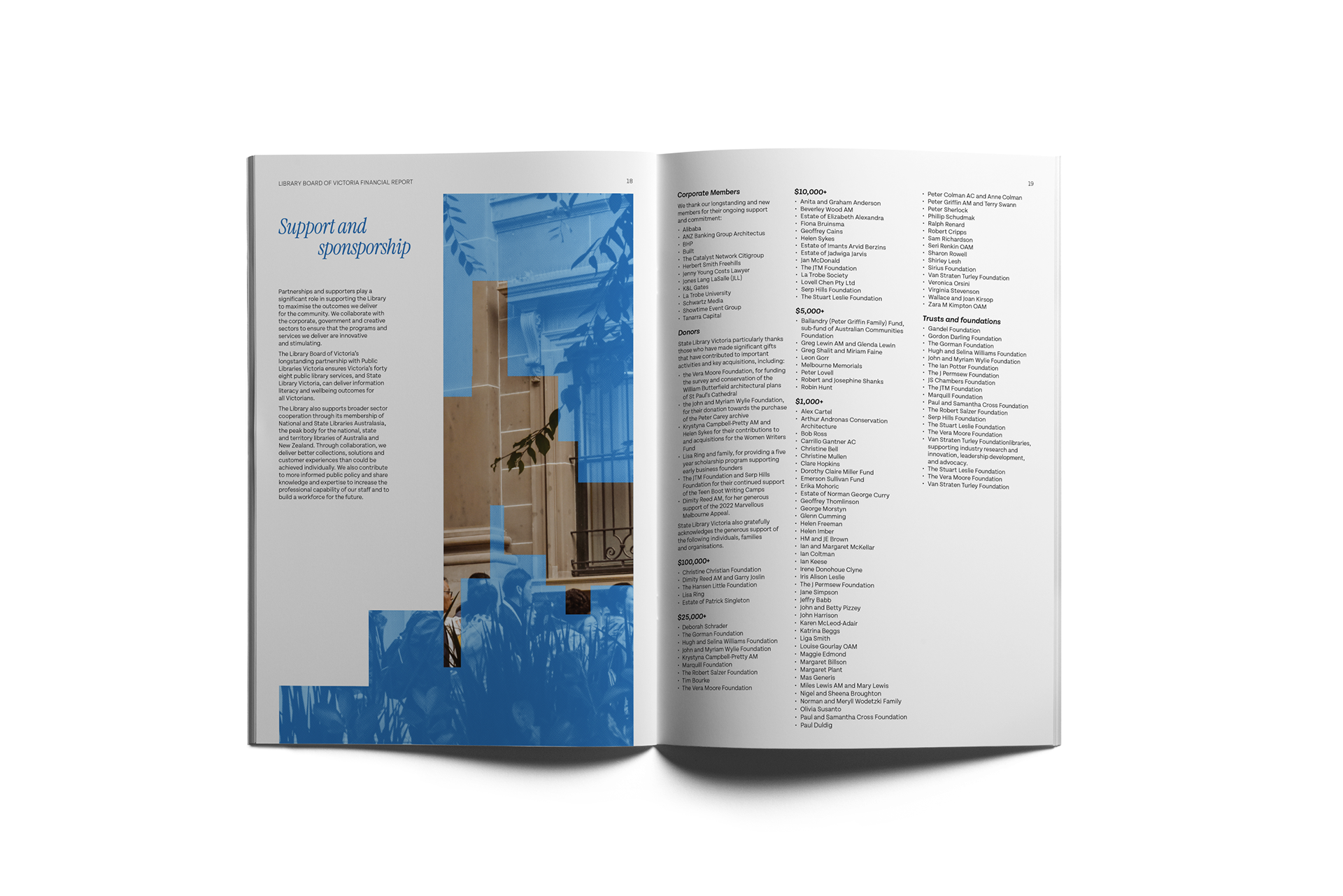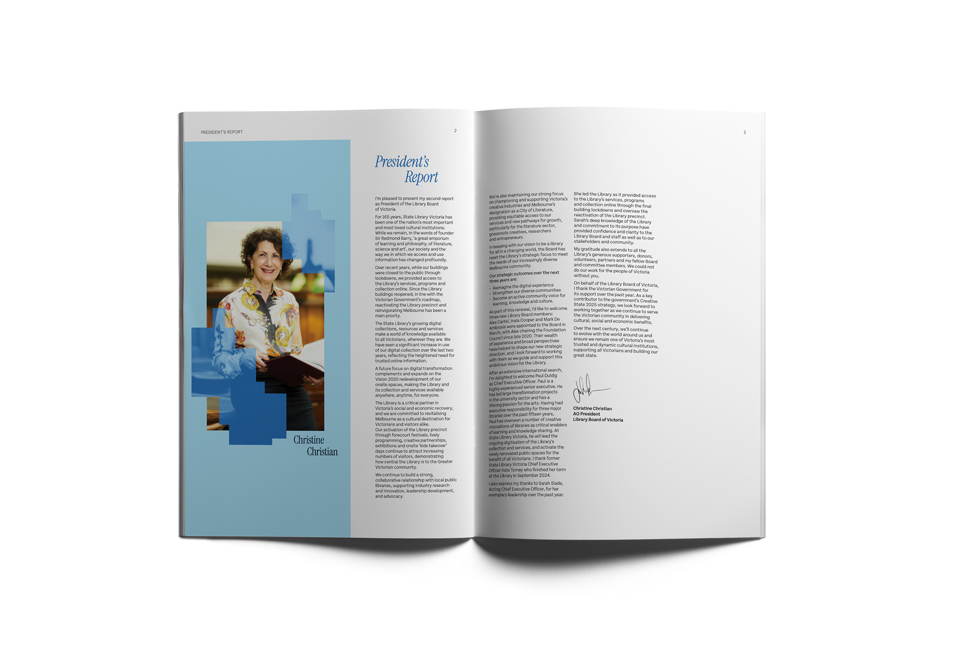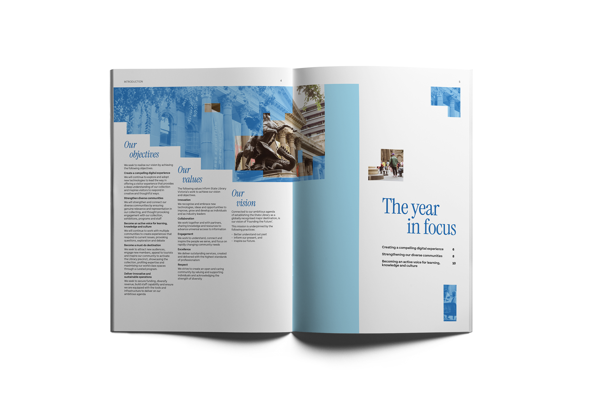 A 24-page annual report publication expressing the values of ‘better understanding our past, informing our present, and inspiring our future’. A dynamic and irregular geometric image making style was developed to fragment photography into the ‘present’ and ‘future’. This image treatment is applied to self-directed photography, creating a strong visual contrast whilst simultaneously forming a unified whole.
